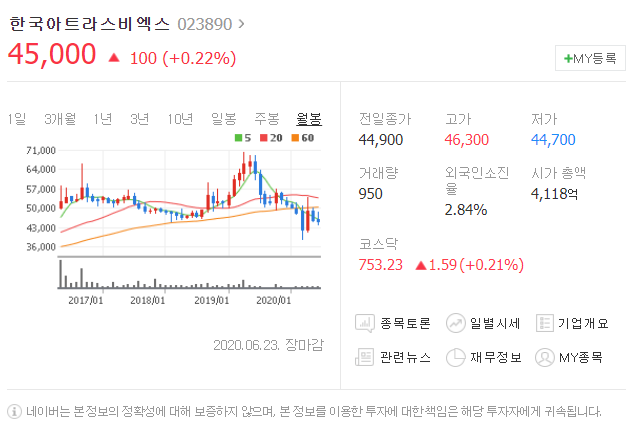 전일대비 100원 상승했으며, 6월 23일 45000원으로 마무리 되었네요.
