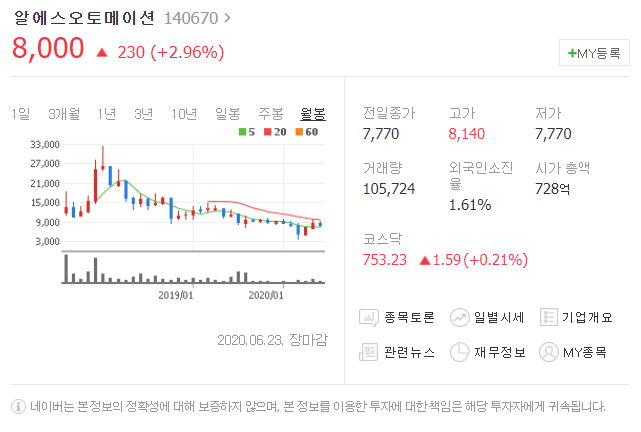 전일대비 230원 상승했으며, 6월 23일 8000원으로 마무리 되었네요.
