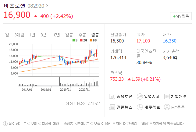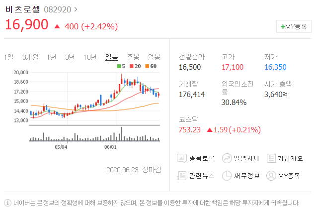 전일대비 400원 상승했으며, 6월 23일 16900원으로 마무리 되었네요.