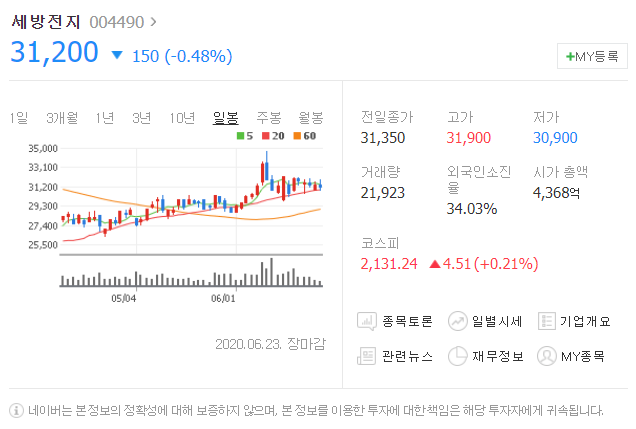전일대비 150원 하락했으며, 6월 23일 31200원으로 마무리 되었네요.