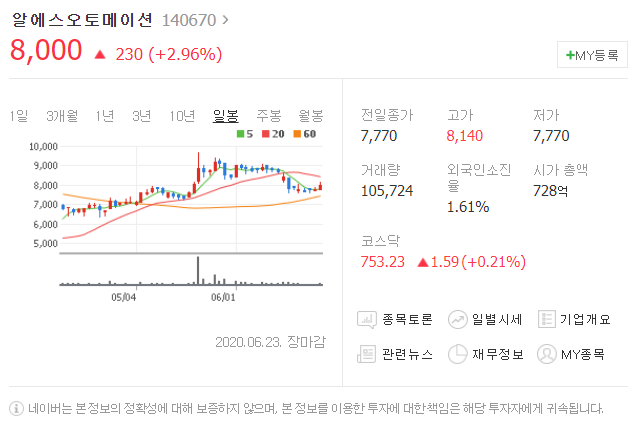 전일대비 230원 상승했으며, 6월 23일 8000원으로 마무리 되었네요.