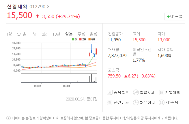 전일대비 3550원 상승했으며, 6월 24일 15500원으로 마무리 되었네요.