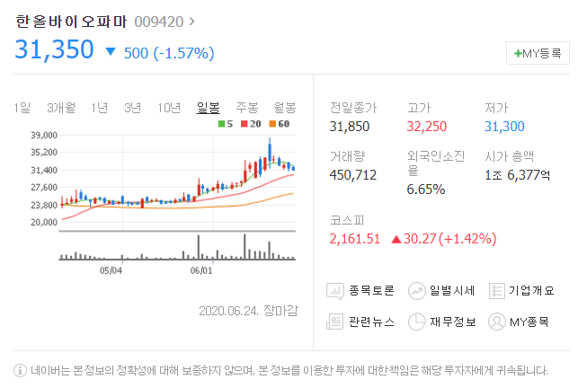 전일대비 500원 하락했으며, 6월 24일 31350원으로 마무리 되었네요.