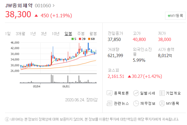 다섯번째는 JW중외제약입니다. [ 001060 ]