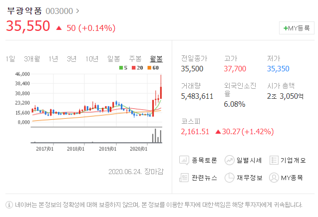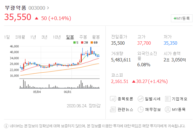 전일대비 50원 상승했으며, 6월 24일 35550원으로 마무리 되었네요.