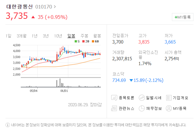 다섯번째는 대한광통신입니다. [ 010170 ]