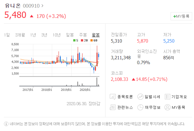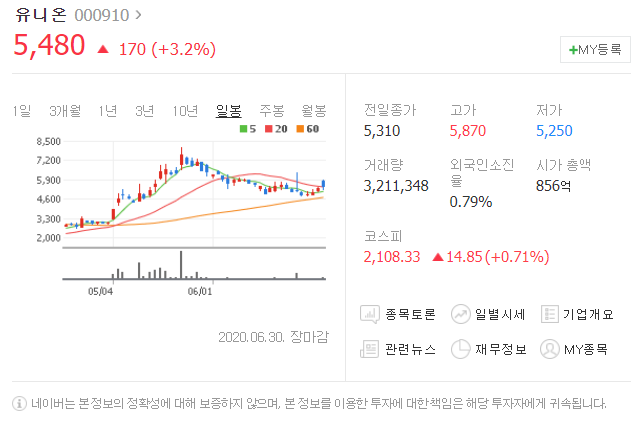 전일대비 170원 상승했으며, 6월 30일 5480원으로 마무리 되었네요.