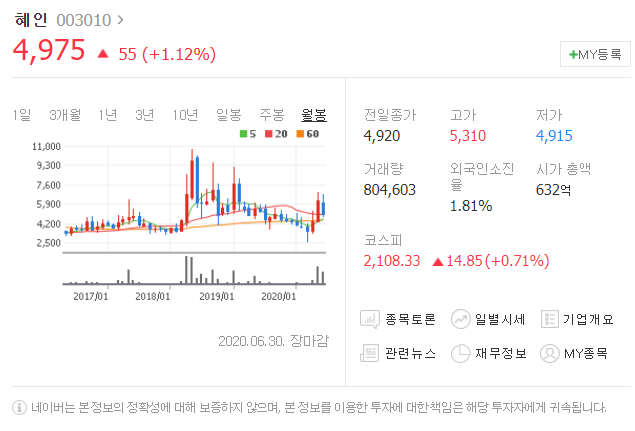 전일대비 55원 상승했으며, 6월 30일 4975원으로 마무리 되었네요.