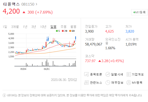 전일대비 300원 상승했으며, 6월 30일 4200원으로 마무리 되었네요.