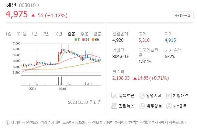 전일대비 55원 상승했으며, 6월 30일 4975원으로 마무리 되었네요.