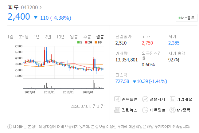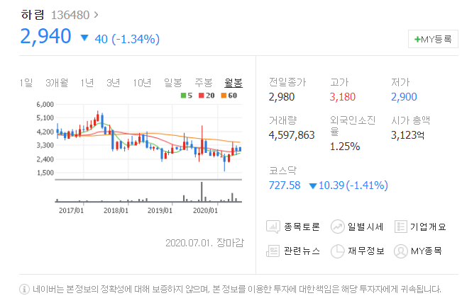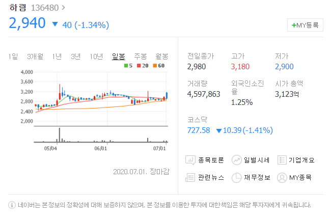 전일대비 40원 하락했으며, 7월 1일 2940원으로 마무리 되었네요.