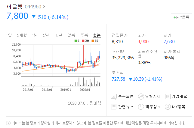 전일대비 510원 하락했으며, 7월 1일 7800원으로 마무리 되었네요.