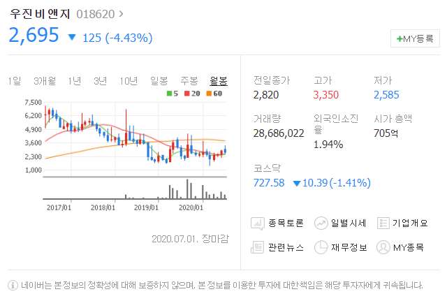 전일대비 125원 하락했으며, 7월 1일 2695원으로 마무리 되었네요.