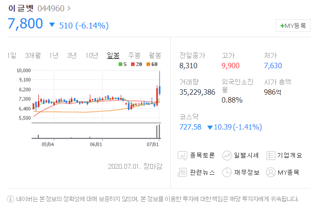 전일대비 510원 하락했으며, 7월 1일 7800원으로 마무리 되었네요.