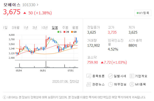 7월 3일보다 50원 상승했으며, 7월 6일 3675원으로 마무리 되었네요.