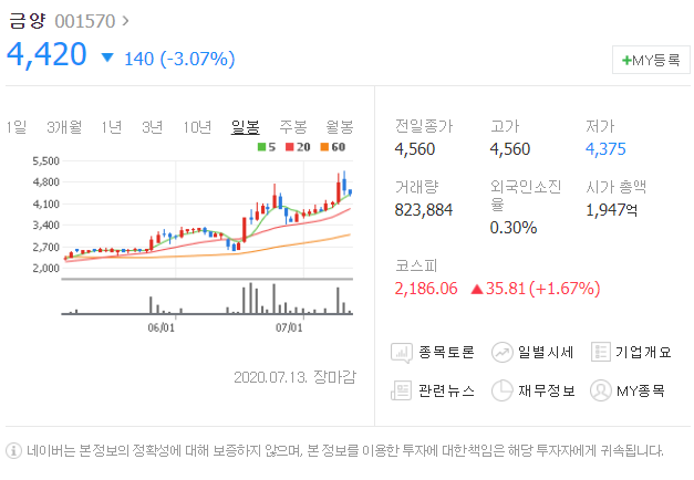 7월 10일보다 140원 하락했으며 7월 13일 4420원으로 마무리 되었네요.
