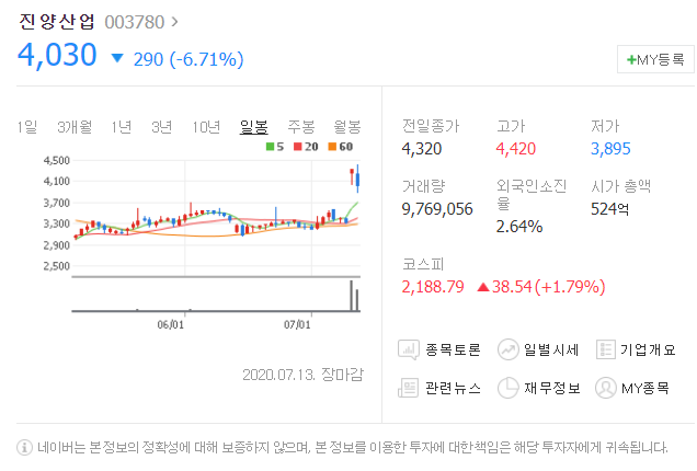 7월 10일보다 290원 하락했으며, 7월 13일 4030원으로 마무리 되었네요.