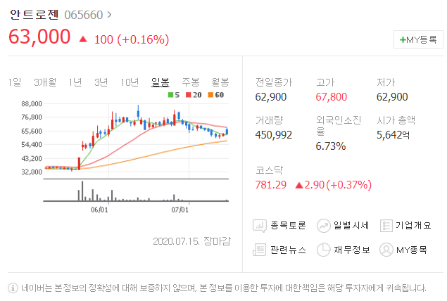 전일대비 100원 상승했으며, 7월 15일 63000원으로 마무리 되었네요.