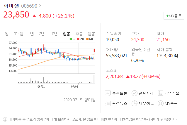 전일대비 4800원 상승했으며, 7월 15일 23850원으로 마무리 되었네요.