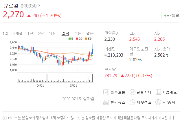 전일대비 40원 상승하였으며, 7월 15일 2270원으로 마무리 되었네요.