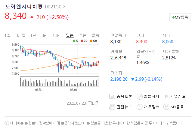 전일대비 210원 상승했으며, 7월 20일 8340원으로 마무리 되었네요.
