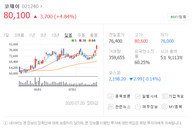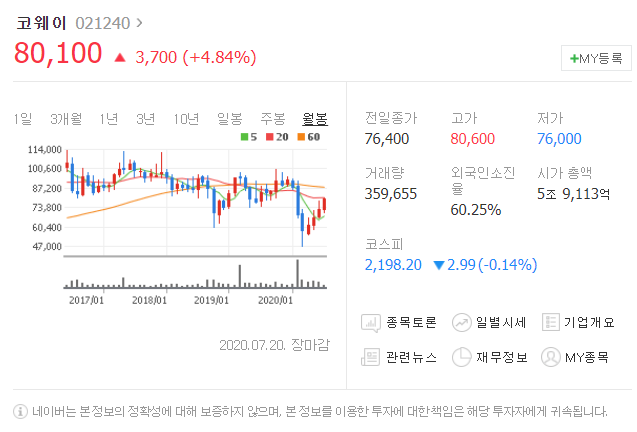 세번째는 코웨이입니다. [ 021240 ]