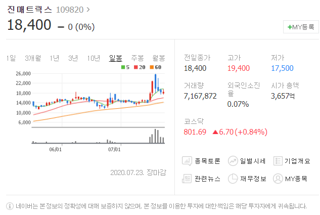 전일대비 변동 없으며, 7월 23일 18400원으로 마무리 되었네요.