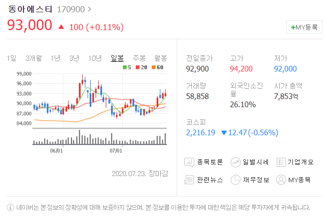 전일대비 100원 상승했으며, 7월 23일 93000원으로 마무리 되었네요.