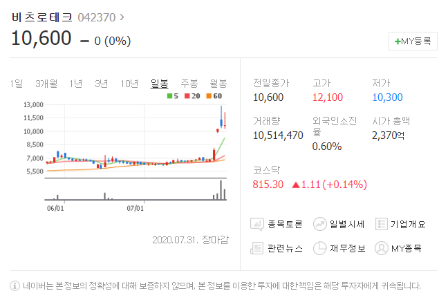 7월 31일 변동 없으며, 7월 31일 10600원으로 마무리 되었네요.