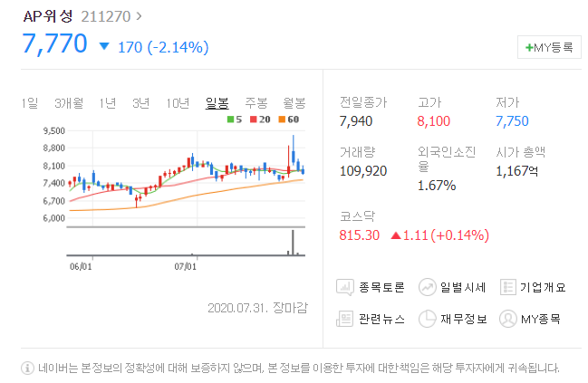 7월 31일 170원 하락했으며, 7월 31일 7770원으로 마무리 되었네요.
