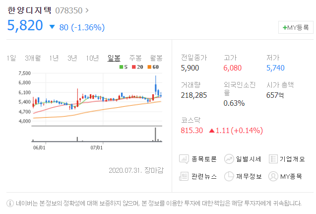 7월 31일 80원 하락했으며, 7월 31일 5820원으로 마무리 되었네요.