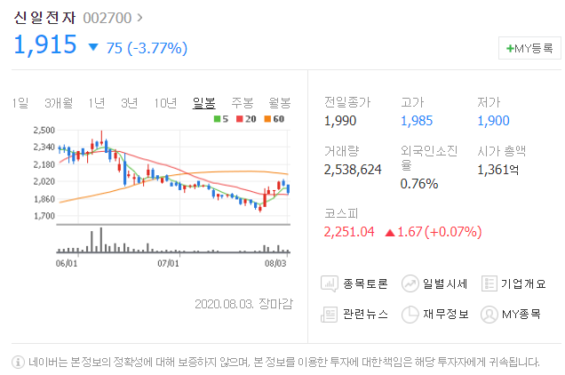 7월 31일보다 75원 하락했으며, 8월 3일 1915원으로 마무리 되었네요.