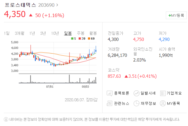 8월 7일 50원 상승했으며, 8월 7일 4350원으로 마무리 되었네요.