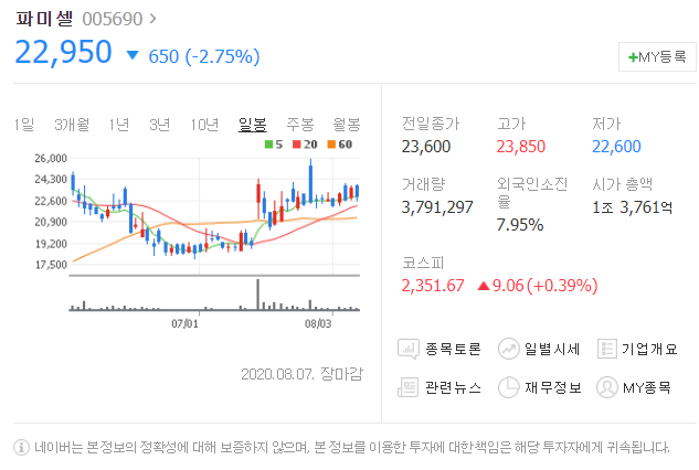 8월 7일 650원 하락했으며, 8월 7일 22950원으로 마무리 되었네요.