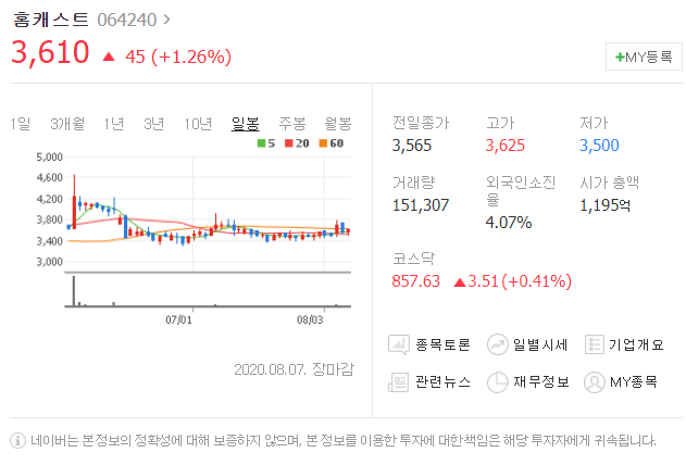 8월 7일 45원 상승했으며, 8월 7일 3610원으로 마무리 되었네요.