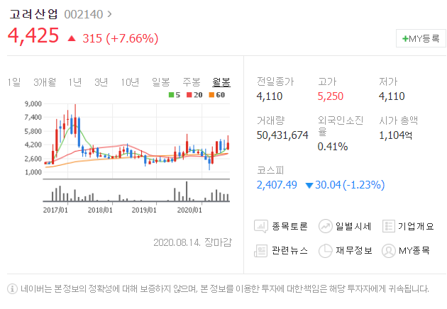 8월 14일 315원 상승했으, 8월 14일 4425원으로 마무리 되었네요.