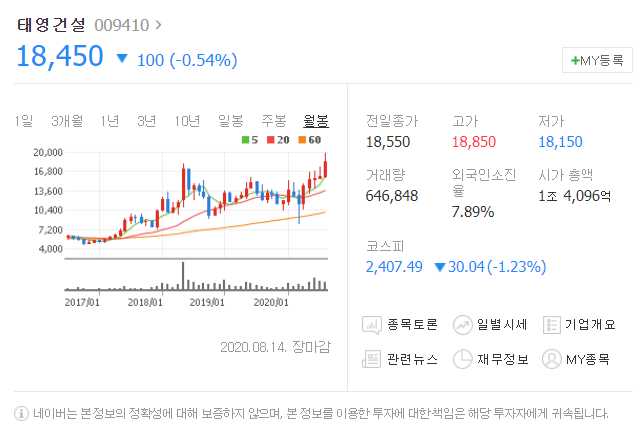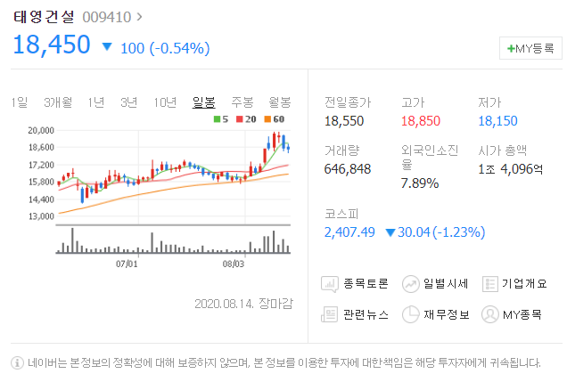 8월 14일 100원 하락했으며, 8월 14일 18450원으로 마무리 되었네요.