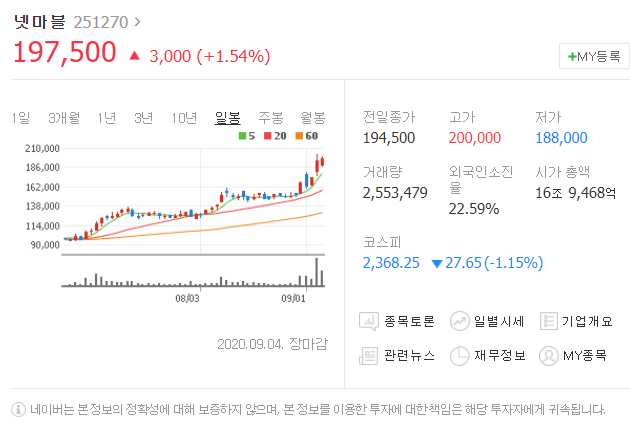 9월 3일 3000원 상승했으며, 9월 3일 197500원으로 마무리 되었네요.