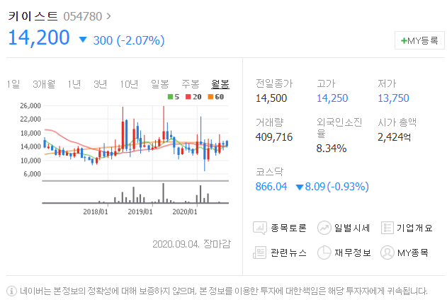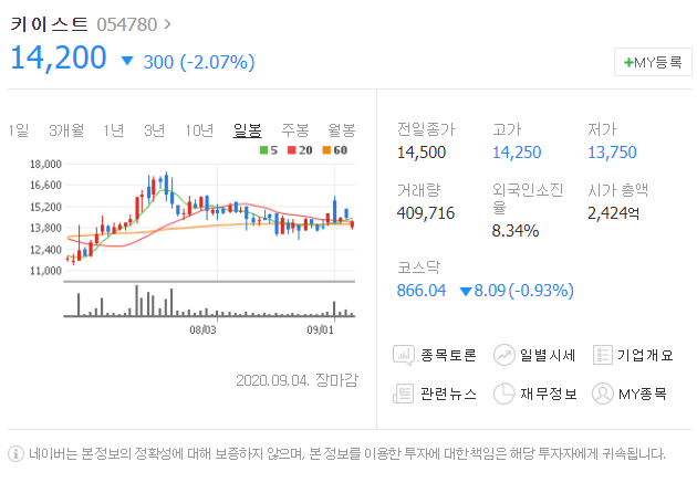 9월 3일 300원 하락했으며, 9월 3일 14200원으로 마무리 되었네요.