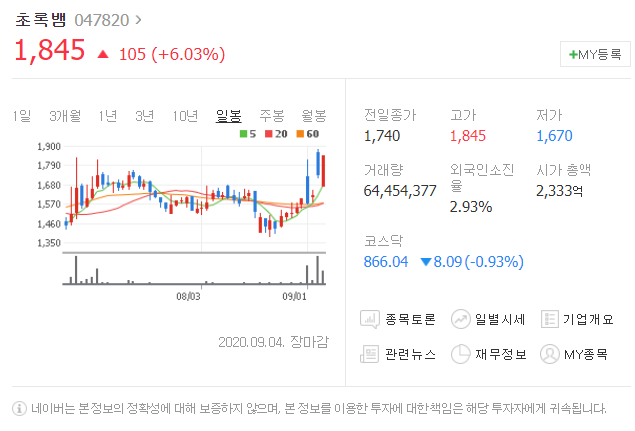 9월 3일 105원 상승했으며, 9월 3일 1845원으로 마무리 되었네요.