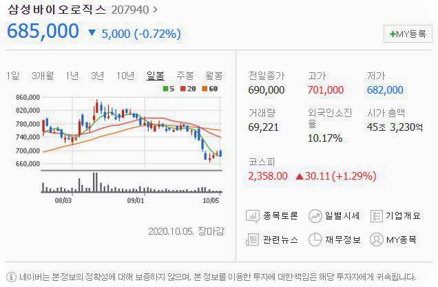 10월 5일 5000원 하락했으며, 10월 5일 685000원으로 마무리 되었네요.