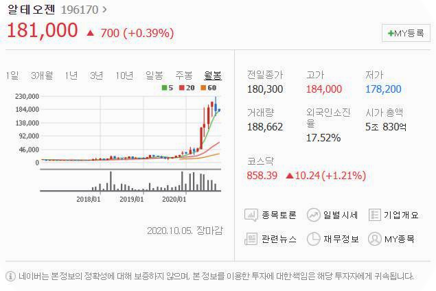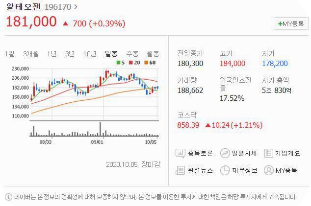 10월 5일 700원 상승했으며, 10월 5일 181000원으로 마무리 되었네요.