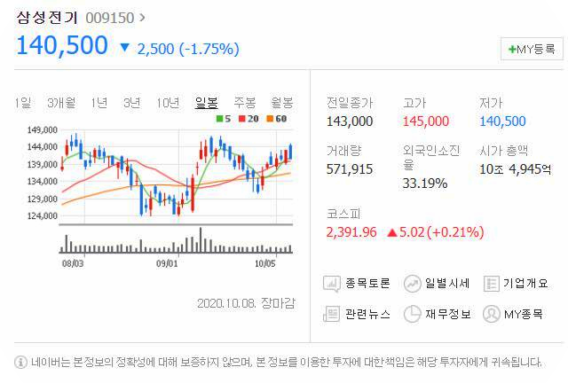 전일대비 2500원 하락했으며, 10월 8일 140500원으로 마무리 되었네요.