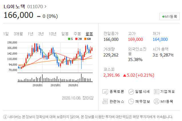 전일대비 변동 없으며, 10월 8일 166000원으로 마무리 되었네요.