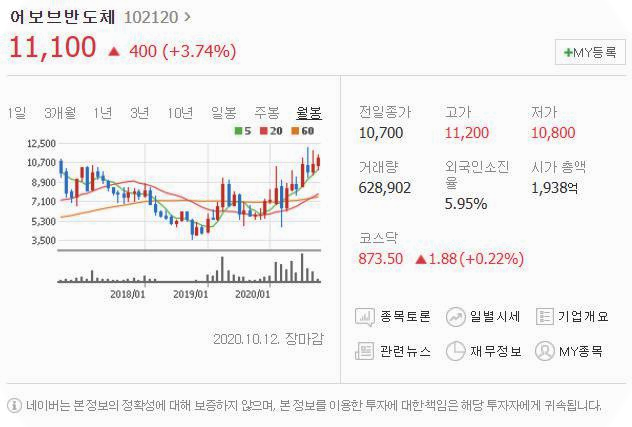10월 8일보다 400원 상승했으며, 10월 12일 11100원으로 마무리 되었네요.