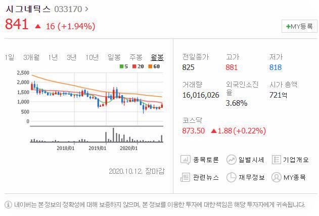 10월 8일보다 16원 상승했으며, 10월 12일 841원으로 마무리 되었네요.