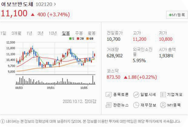 10월 8일보다 400원 상승했으며, 10월 12일 11100원으로 마무리 되었네요.