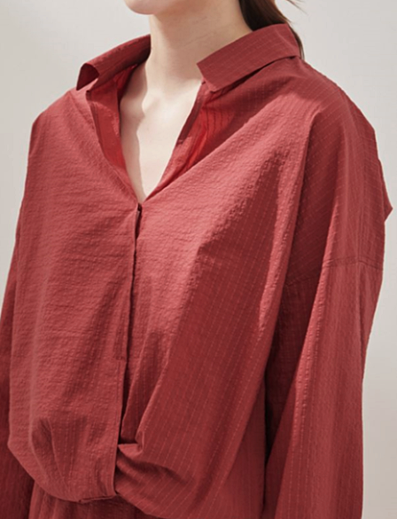 소재는 면과 스판을 혼방한 소재로 착용했을 때 편안하게 착용할 수 있어요. 셔츠스타일의 카라로 답답하지 않게, 분위기 있으면서 세련된 스타일을 연출할 수 있답니다. 색상은 오윤희가 착용한 다크레드와 차분하면서도 시크한 느낌을 줄 수 있는 다크그린 두가지 색상이 있어요.