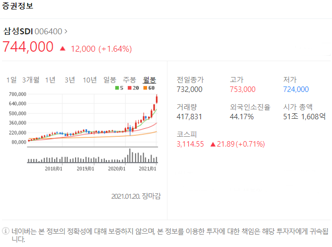 전일대비 12000원 상승했으며, 1월 20일 744000원으로 마무리 되었네요.