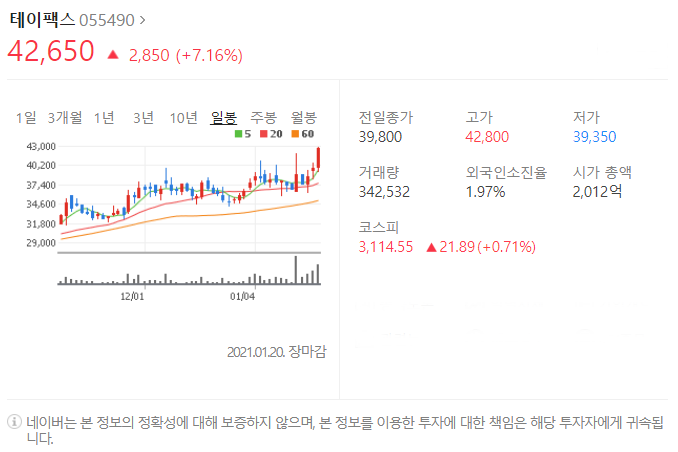 일곱번째는 테이팩스입니다. [055490]